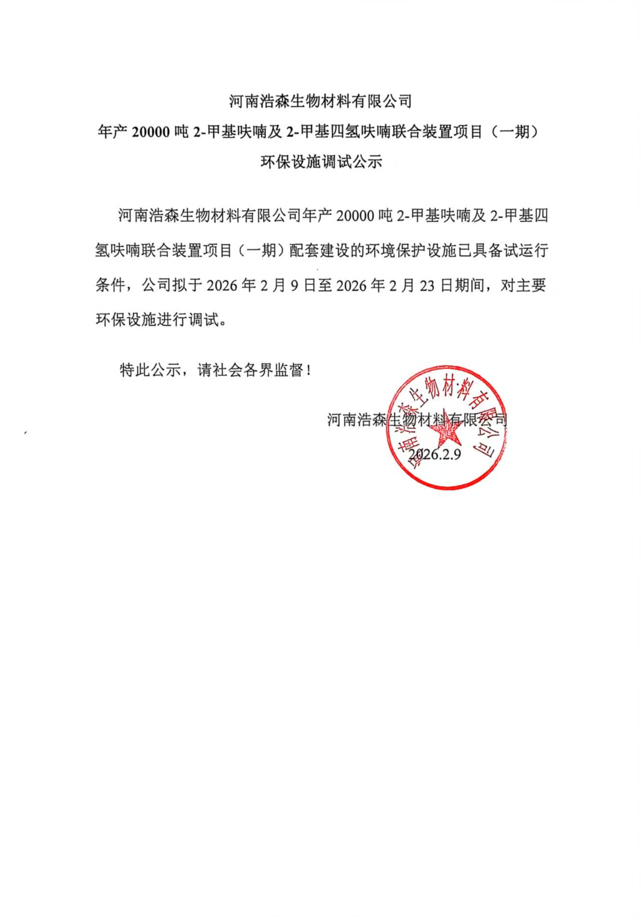 河南浩森生物材料有限公司 年产20000吨2-甲基呋喃及2-甲基四氢呋喃联合装置项目(一期) 环保设施调试公示